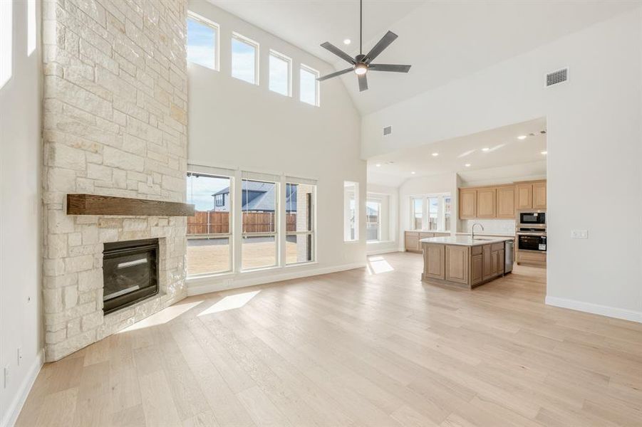Seller pays $15K towards closing costs or rate buy down. NEW! NEVER LIVED IN. Move-In Ready! Bloomfield Homes’ Primrose FE V is a two-story design offering 4 bedrooms, 3 bath, 1 half bath, and a well-balanced layout that layers everyday function with flexible living spaces. The exterior presents a refined contrast with Acme Winterstone brick, Austin White sawn stone accents, cedar trim details, an 8' 5-Lite front door, and Onyx exterior paint, setting a polished tone from the start. The open first floor is lined with engineered wood flooring in high-traffic areas, guiding the you from the foyer into the open family room where a dramatic stone-to-ceiling fireplace touches the 1' vaulted ceiling. The Deluxe Kitchen is positioned to connect seamlessly, showcasing Charleston-style cabinetry in a Driftwood finish, Playa White quartz countertops with a bullnose edge, a single-bowl sink, gas cooktop underneath a wood vent hood, and a clean-lined backsplash that keeps the palette cohesive. A walk-in pantry, buffet at the breakfast nook, deep pan drawers, and a trash-pull out drawer provide lots of storage! A dedicated study with glass French doors creates a defined workspace near the front of the home, while the main level also includes a mud room off off the garage and a laundry room with added utility sink. The primary suite is a large getaway with separate vanities, a deck mount tub, bench seat shower, and roomy closet. Upstairs, the layout shifts to secondary living with a game room and media room, supported by an additional bedroom that has ensuite bath access. Practical features throughout include a 3-car garage with two bays, a tankless water heater, window seats, exterior lighting, a full landscaping package, and much more! Liberty residents enjoy access to a pool with splash pad, trails, volleyball and basketball courts, a soccer field, and a playground. Visit or call the Bloomfield Homes model in Liberty today!