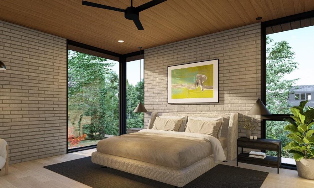 A dedicated office offers a calm, focused workspace. The primary suite is a true retreat—minimal, serene, and intentionally designed—with a spa-like bath that reinforces the home’s relaxed, modern feel.