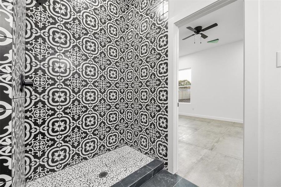 The kitchen is thoughtfully designed with quartz countertops, custom cabinetry, stainless steel appliances, and eye-catching designer tile backsplash—perfect for both daily living and entertaining. The spacious primary suite features a spa-style bathroom with double vanities, designer finishes, and a large walk-in closet with built-in shelving.