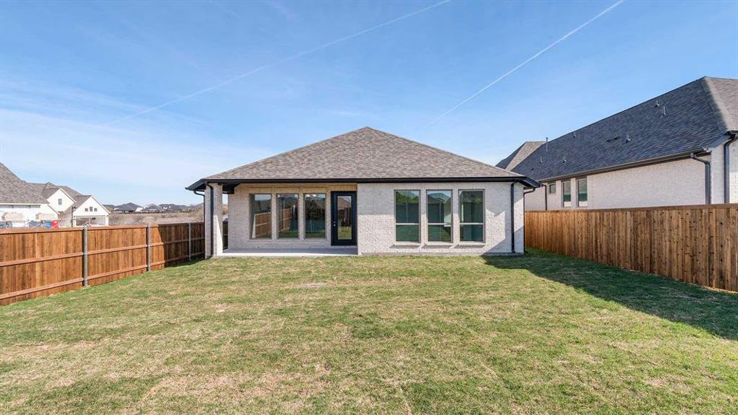 Entry welcomes you with a 12-foot ceiling. Open kitchen offers a center island, a 5-burner gas cooktop, and a spacious pantry. Dining area flows into open family room with wall of windows. Secluded primary suite includes primary bath with dual vanities, garden tub, separate glass-enclosed shower and a large walk-in closet. Abundant closet space in the secondary bedrooms. Covered backyard patio. Mud room off the two-car garage.