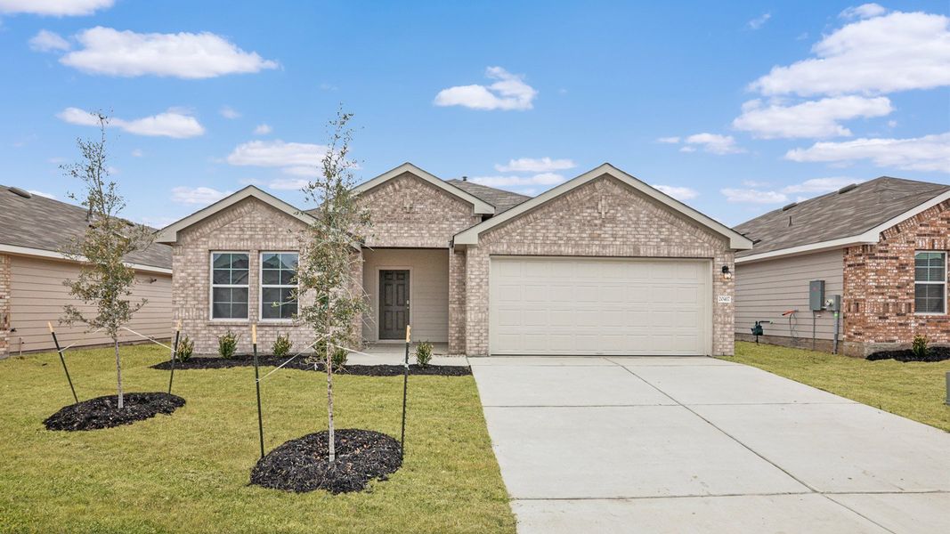 Welcome to 20417 Tuberville Lane, a single-story home that offers 1,574 square feet of living space in our Carillon community in Manor, TX. The Denton features a two-car garage, three bedrooms and two bathrooms.