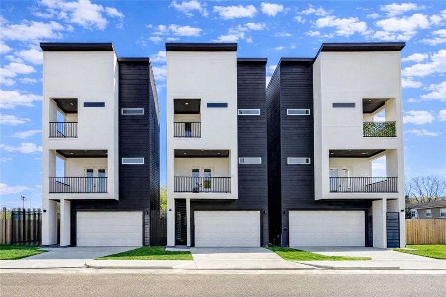 Modern new-construction homes with private driveways offering three-story living in an urban setting. Each home includes three bedrooms, three and a half bathrooms, and high ceilings that create a bright, open interior. The main living level features an open living and dining area with access to a private balcony. A flex room offers versatility for a home office, pet space, or additional use. The kitchen is finished with quartz countertops, stainless steel appliances, ample cabinetry, and a central island. The primary bedroom includes access to a private balcony. Bedrooms are arranged for privacy and feature ensuite bathrooms with contemporary tile finishes. Select homes offer fenced outdoor yard space. Conveniently located near Downtown Houston and EaDo with access to dining, entertainment, parks, walking trails, and minutes from 9 Hole Par 3 Golf Course with pickleball courts. Suitable for homeownership or long-term rental use. Ask about builder and lender incentive.