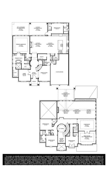 The grand entryway unfolds to reveal a sweeping curved staircase. French doors open into a home office, while across the hall, the formal dining room awaits. Step into the two-story family room, which offers a warming wood mantel fireplace and a wall of windows. The morning area seamlessly connects the living space to the kitchen, which boasts an island with built-in seating, ample counterspace, a walk-in pantry, a 5-burner cooktop, 2 wall ovens, and a butler's pantry, with easy access to the utility room. The primary suite features a wall of windows and French doors that open into the primary bathroom. This retreat includes dual vanities, a freestanding tub, a separate glass-enclosed shower, and two walk-in closets. A private guest suite off the morning area provides comfort. Upstairs, discover a game room with expansive windows and an adjoining media room for entertainment. Secondary bedrooms with walk-in closets and a Hollywood bathroom complete the second floor.
