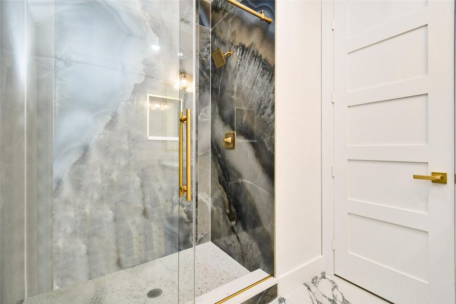Discover modern architectural grandeur in this stunning Saddle Creek Forest New Construction! Spanning 3,196 sq ft on a large cul-de-sac lot, this 5-bed, 3.5-bath masterpiece features a 3-car garage with full bath in garage area, study, and upstairs game room. The soaring two-story great room is anchored by a floor-to-ceiling quartzite stone fireplace. 5 ft wide pivot front door and a magnificent crystal chandelier. A chef’s marble kitchen showcases a waterfall-edge island with stacked stone accents, professional-grade appliances, and dramatic book-matched stone backsplashes. The primary retreat offers a spa-like bath with agate-style stone slabs, gold hardware, and quartz vanities. Throughout the home, find 8ft five-panel shaker doors, many pocket doors, and a mix of high-gloss porcelain and wood-look flooring. Enjoy seamless indoor-outdoor living via expansive glass sliders to the covered patio.