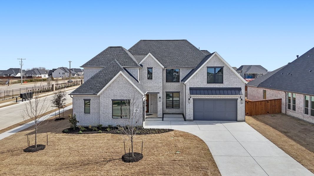 New construction on an interior corner lot in Prosper ISD features a dramatic two-story entry with a spiral staircase, abundant windows for natural light, and open railing overlooking the game room above. A cast stone fireplace surround, white oak hardwood flooring including the staircase, and custom lighting await you in this one-of-a-kind custom home. The gourmet kitchen boasts Calcutta Elysio countertops, KitchenAid appliances, an apron-front sink, a separate recessed pocket office, and extensive custom cabinetry to the ceiling. The spa-inspired primary bath highlights a freestanding tub as its focal point and includes separate vanities, a huge walk-in closet, a private shower, and a separate coffee bar area. The perfect upstairs is a plan favorite, featuring a centralized game room and en suite bedrooms and bathrooms in each corner of the second floor, offering privacy for each room. Come see me!