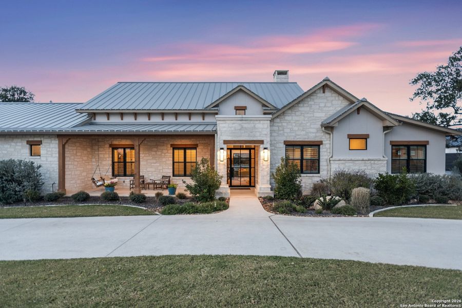 An exceptional Hill Country estate on the most coveted street in Pecan Springs, this one-story residence delivers refined craftsmanship, privacy, and resort-style living on just over an acre. Positioned on a quiet cul-de-sac street with minimal traffic, the home enjoys long-distance views and no rear neighbors, offering a rare sense of seclusion. The exterior makes a striking first impression with German-smeared limestone covering approximately 80% of the home, a timeless metal roof, circular drive, and an oversized three-car garage providing abundant parking. Impeccable landscaping with stone-bordered flowerbeds frames the property, while the north-south orientation enhances year-round comfort and helps beat the Texas summer heat. Inside, architectural details and elevated finishes define every space. A dramatic glass-and-iron front door opens to a double-height entry, wide-plank oak floors, hand-scraped walls, and cathedral ceilings accented by wood beams. German-smeared limestone columns and Michael Edwards cabinetry reflect thoughtful design and artisan quality throughout. The living area is both grand and inviting, designed to showcase the home's natural light and views. The kitchen is a true centerpiece, anchored by a stunning 9-foot marble island with apron-front sink, JennAir built-in appliances, and a six-burner gas cooktop. A fully functioning working pantry with sink and generous counter space keeps everyday appliances tucked away while enhancing functionality for entertaining. The primary suite is a private retreat with direct outdoor access and serene views of the pool and Texas Hill Country. The spa-inspired bath features a freestanding garden tub, walk-in shower, and an impressive 180-square-foot closet complete with a center island. Three secondary bedrooms provide flexible living options, including one with custom built-in bunk beds that doubles as a media or flex space with an en-suite bath and exterior access-ideal as a pool bath. The remaining bedrooms share a Jack-and-Jill bath, with one thoughtfully designed as a flex room featuring a Murphy bed, built-in desk, and bookshelves. Outdoor living is equally exceptional. A covered back patio spanning the full width of the home offers multiple seating and entertaining areas, along with a dedicated storage room for pool and outdoor essentials. The resort-style pool and hot tub are complemented by an outdoor cooking area, while a level section of the property provides the perfect spot for a children's play area or open lawn activities. Blending timeless materials, functional luxury, and an unbeatable setting, this Pecan Springs home offers privacy, views, and craftsmanship rarely found-all on one of the neighborhood's finest streets.