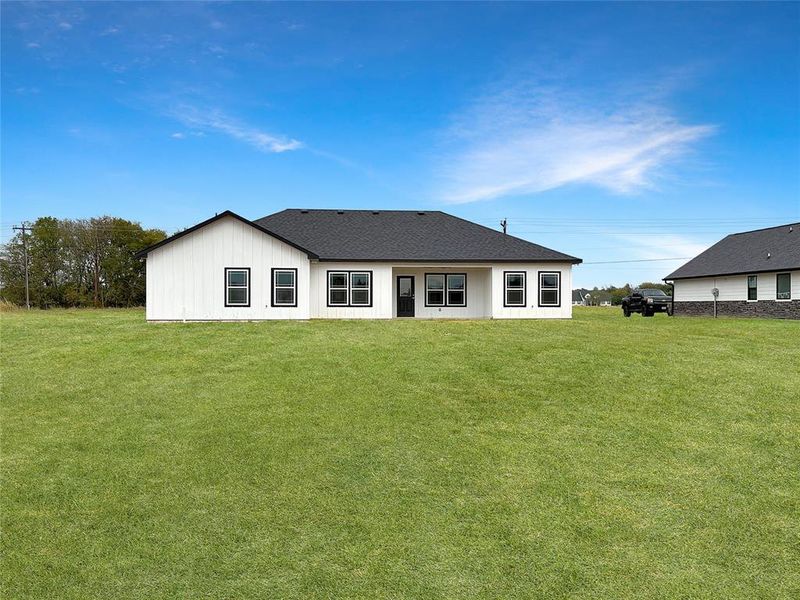 This crisp white farmhouse-style beauty has black trim, a covered porch, and a 2-car garage. Inside are vaulted ceilings, wood-look Luxury Vinyl floors and an open living-kitchen-dining flow perfect for hanging out. Kitchen highlights include white shaker cabinets, navy island with X-bracing, quartz counters, stainless appliances (fridge included!), a farmhouse sink and pendant lights. The primary suite equals pure luxury; big bedroom + spa bath with freestanding tub, huge walk-in shower, dual vanities and a massive closet. Two cozy guest bedrooms, sleek second bath, tons of natural light, energy-efficient features and peaceful country views round out this country showpiece. Move-in ready in North Lamar ISD -- fresh, modern and waiting for you!