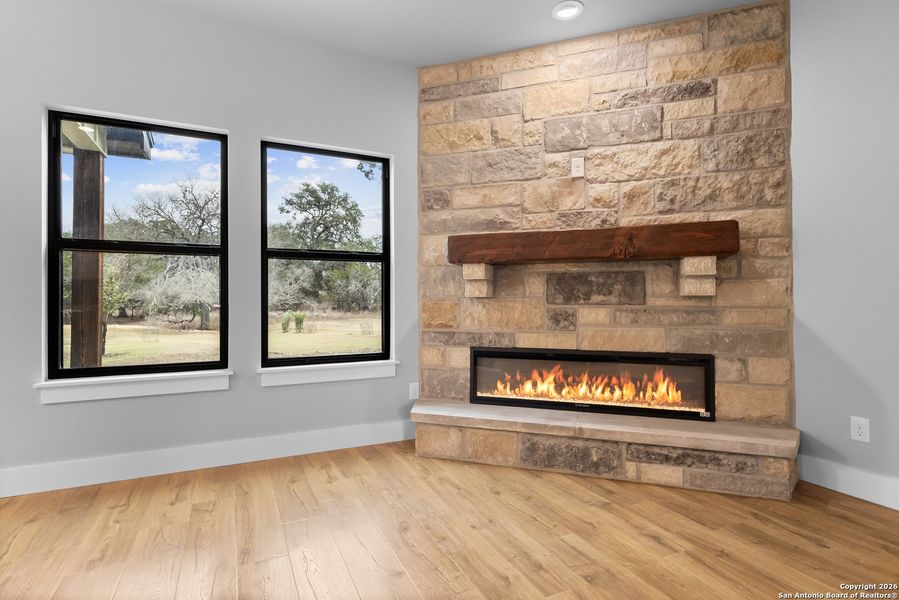 This stunning 4 bedroom, 2.5 bathroom home is filled with breathtaking natural light and showcases a thoughtfully designed layout that feels both grand and inviting. The first floor living space is anchored by a dramatic floor to ceiling brick fireplace with customizable flame colors, allowing you to set the perfect ambiance for any occasions or quiet evenings as the area flows seamlessly into the kitchen and dining spaces. The eat in kitchen is a true showstopper, featuring a spacious island, generous counter space, a walk in pantry, and abundant cabinetry designed to support entertaining and everyday living. A sun-filled bedroom or home office on the main level offers versatility, enhanced by expansive windows that bring the outdoors in. The primary suite is a luxurious retreat with soaring vaulted ceilings, a spa inspired bathroom featuring dual vanities, a soaking tub, and an oversized wet room style shower, complemented by a generous walk in closet with custom shelving. Upstairs, a secondary family room opens onto a private balcony overlooking the gorgeous fairway providing a covered outdoor living space that elevates indoor outdoor living. Foam insulation and a water softener contribute to efficiency and comfort, while the spacious garage, mudroom, and well proportioned yard complete this exceptional home that truly stands out.