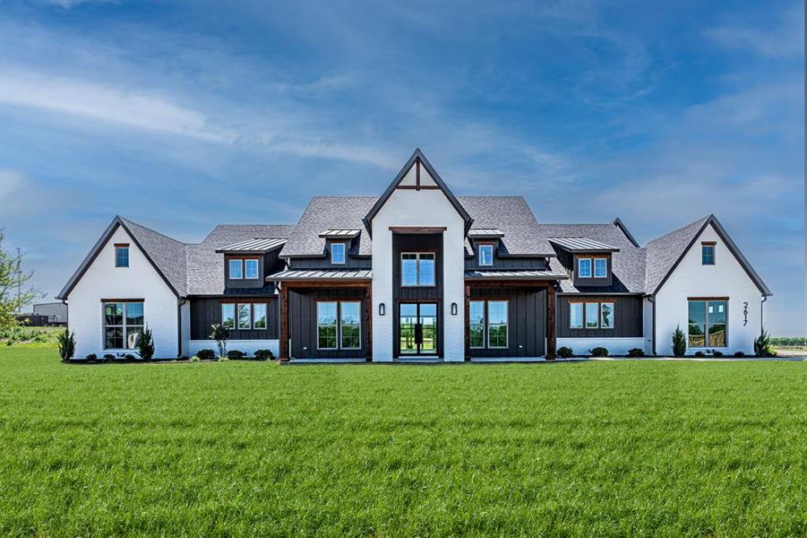 Step into upscale Texas living in this stunning 4-bedroom, 4.5-bath custom masterpiece on nearly an acre in the exemplary Argyle ISD. Thoughtfully designed for both everyday comfort and unforgettable entertaining, the open-concept effortlessly connects the kitchen, dining, and living spaces in a light-filled, welcoming layout. The kitchen features an oversized island with built in 60” refrigerator, pro-style range and microwave drawer. Walls of glass—anchored by 16’ Bi-fold doors that open to the expansive covered rear patio create a seamless indoor-outdoor lifestyle perfect for entertaining. Enjoy evenings by the wood burning outdoor fireplace, with a gas and water stubbed out ready for your future outdoor kitchen, all overlooking an open backyard retreat. The great room commands attention with a contemporary sleek linear electric fireplace with built-ins and floating shelves. Every detail reflects refined craftsmanship with the custom wine room, floating shelves, engineered white oak wood floors, quartzite countertops, and carefully curated designer lighting with champagne bronze plumbing fixtures. The chef’s kitchen is as functional as it is beautiful, featuring a spacious walk-in pantry with custom cabinetry, while the dining area is enhanced by a stylish built-in wine bar—perfect for entertaining. The primary suite is a true sanctuary, offering a spa inspired walk in shower with dual shower heads, a stand alone bath tub and a large custom walk-in closet with island designed for luxury living. The home also includes a secondary en-suite, private office, and two additional bedrooms with ensuite bath ideal for guests or multigenerational living. This is more than a home—it’s a lifestyle defined by elegance, space, and exceptional design. The home has been completed and is Move in Ready.