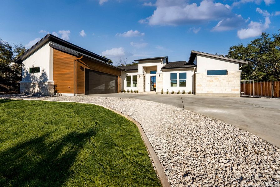 Beautifully designed single-story home in Timberwood Park featuring 2,636 sq ft of living space with 4 bedrooms, 3 baths, and a dedicated study. The open-concept layout offers tall interior doors, arched transitions, and a seamless flow from the kitchen and great room to a large covered rear veranda. The kitchen includes custom cabinetry, quartz countertops, and a spacious island. The primary suite features a walk-in closet, soaking tub, and dual vanities, with a split-bedroom layout providing added privacy. Additional features include a 2-car garage with interior utility access and a masonry + siding exterior. Located in a highly sought-after community known for its 4-acre lake, walking trails, pool, playground, sports courts, fitness track, and clubhouse. Minutes from Stone Oak shopping, dining, schools, and medical facilities. Presale buyers may still select interior paint, lighting packages, plumbing fixtures, and cabinet hardware, depending on build stage.