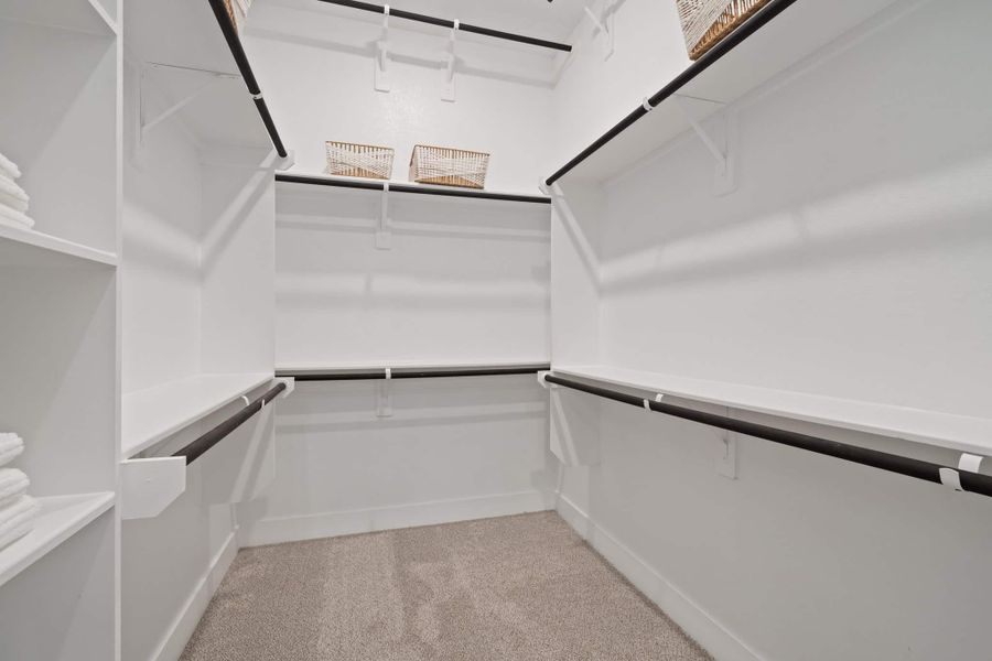 The private primary suite sits at the rear of the home, featuring a spa-like bath with dual vanities, a walk-in shower, linen storage, and a spacious walk-in closet. The nearby utility room adds convenience.