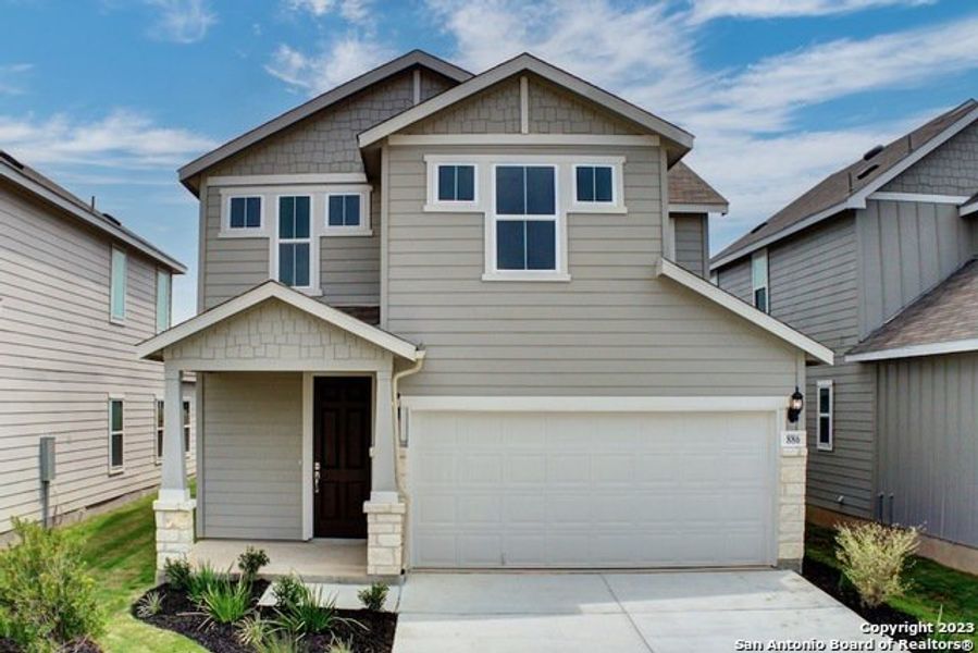 Final Opportunity! The only new home community just a golf cart ride away from Gruene Hall, the Guadalupe River, and downtown New Braunfels. The Brazos plan is a 3 bed 2 bath two story home complete with a Game Room. Exterior features include white stone detailing, 2 car garage with 2 coach lights, covered patio with tongue & groove soffit at entry and wood stained posts. Powder rooms, a coat closet, and stairs to second level are located off the entryway/foyer. Living Room is open to the Dining Room & Kitchen. Dining Room features a window seat. The kitchen is accentuated with an enlarged island with a half wall and 10" overhang at the bar top along with two plugs. The kitchen has stainless steel appliances, and plenty of storage with 42" cabinets and a pantry. Owner's suite is located on the main floor and split from secondary rooms which reside on the second floor along with a game room. Owner's bath has a fixed window for natural light, tile shower, water closet, and a large owner's closet. This community features Comal ISD schools and is surrounded by local shops, great dining, and some of the best BBQ spots in Texas. Enjoy outdoor recreation along the rivers and nearby natural areas.