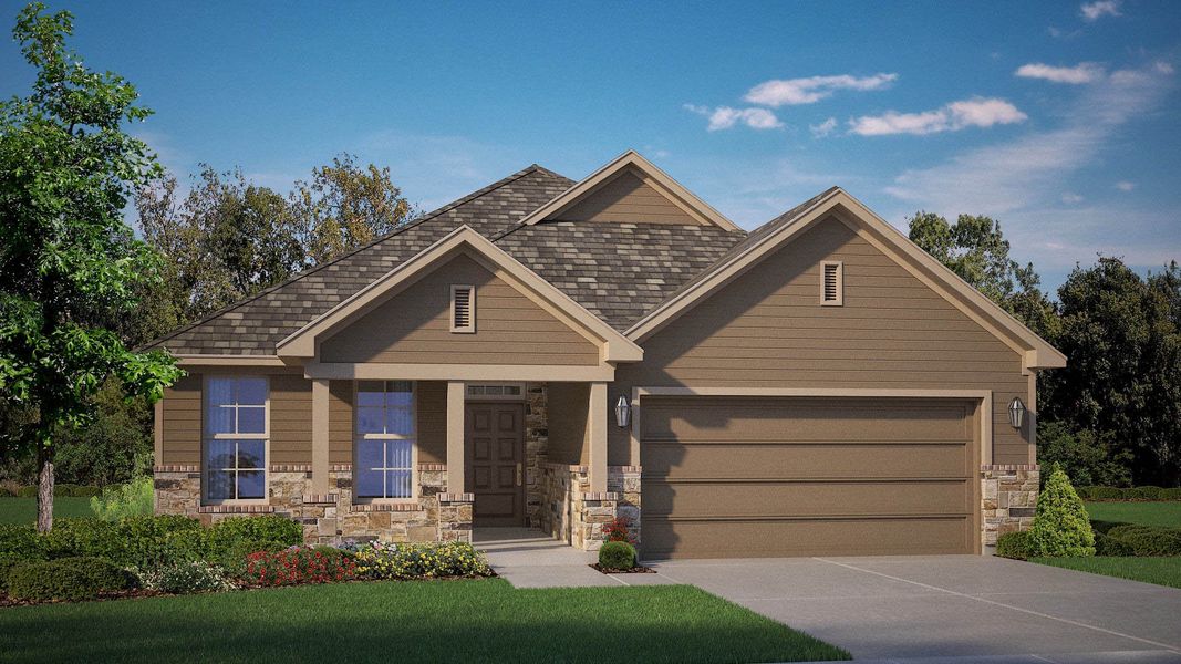 The Baswood plan is a one-story home featuring 4 bedrooms, 2 baths, and approx 1,931 square feet of living space. The front porch and foyer leads to an open-concept kitchen, dining area, and family room. The kitchen includes an upgraded island with beautiful granite or quartz counter tops, undercabinet lights, built-in stainless steel appliances with gas cooktop, and a spacious walk-in pantry. The separate utility room is located just off the kitchen. The private main bedroom is located off the family room and features an attractive ensuite bathroom with luxury walk-in shower with seat, garden tub, and walk-in closet. The covered patio is located off the dining room.