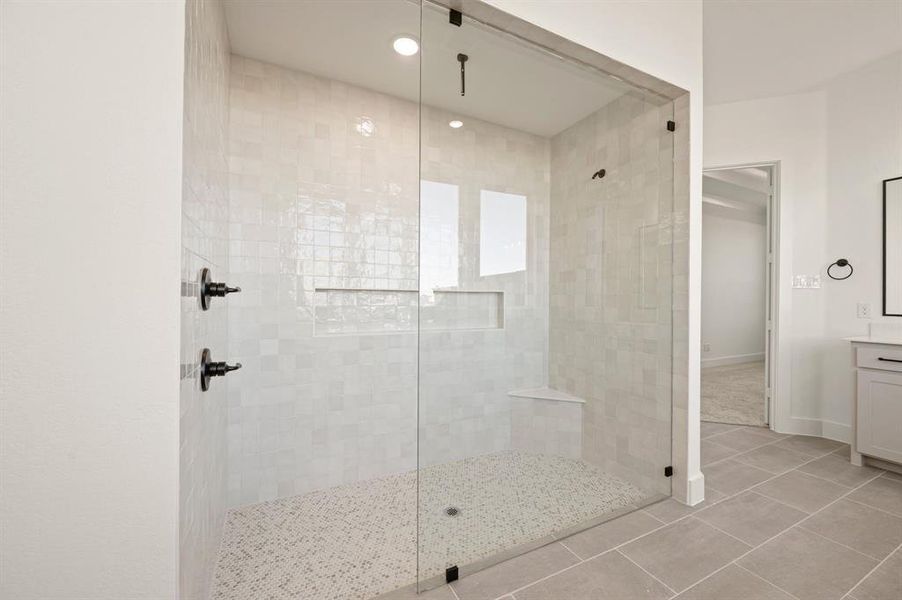 The owner's suite occupies its own private wing on the right side of the home, offering serene views of the lush backyard. The spa-inspired owner's bath features a large walk-through shower, a freestanding soaking tub, dual vanities, and a spacious walk-in closet that conveniently connects to the laundry room.
