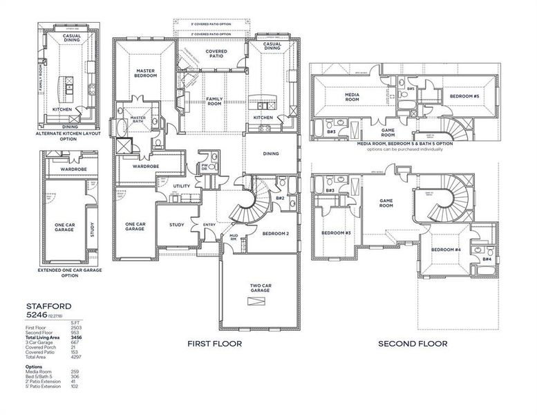 Popular open concept home features a dramatic two-story entry with a curved staircase. The family room and kitchen have beautiful vaulted ceilings. The home offers five bedrooms and five full bathrooms, four of which are en suite, along with a powder bath for guests. The gourmet kitchen includes quartz countertops, upgraded built-in appliances, and a walk-in pantry. The spacious primary retreat features a large walk-in closet, a box-out window, and a generously sized bathroom with an upgraded freestanding tub, large shower, and separate vanities. The primary closet has direct access to the laundry room for added convenience. A guest bedroom with an en suite bathroom and walk-in shower is located on the first floor. Additional upgrades include upgraded flooring, iron spindles at the staircase and game room overlook, and box windows at the casual dining nook.