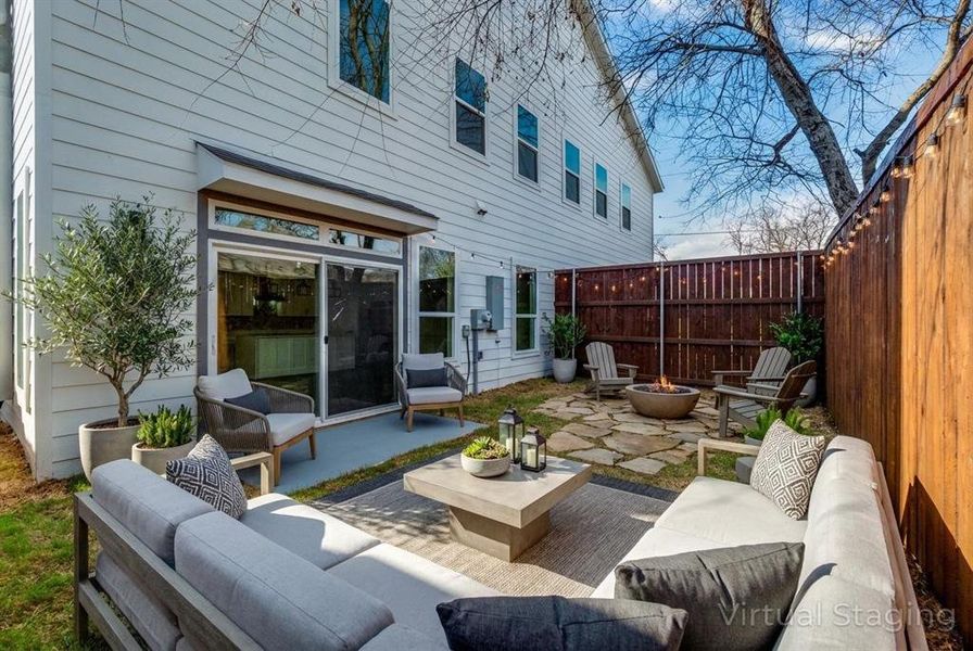 At the top, a private rooftop patio delivers panoramic skyline views of Downtown Dallas, creating an unforgettable setting for sunset gatherings, morning workouts, or quiet evenings under the city lights. Additional outdoor living includes a main-level private patio, offering multiple spaces to relax and recharge.