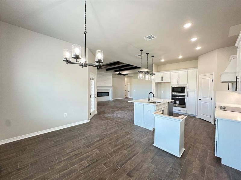 The beamed ceiling in the living room adds a touch of elegance, creating a nice ambiance for relaxing with family and friends. And with an electric fireplace, you can enjoy the flickering flames year-round, adding an extra layer of comfort to your home.
