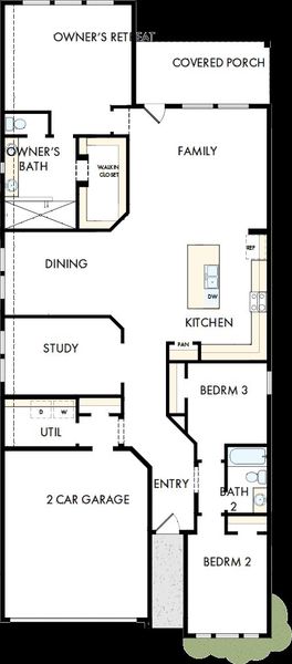 This stunning single-story home combines modern curb appeal with exceptional design on a desirable corner homesite. Featuring 3 bedrooms, 2 baths, and a private study with glass French doors, it’s the perfect balance of style and functionality. The open-concept kitchen includes white and navy cabinetry with 23 doors of storage, quartz countertops, and an impressive 8-foot island wrapped in decorative panels for a designer finish. Rich wood-look flooring flows through all main living areas, complemented by 8-foot interior doors that enhance the home’s spacious feel. The primary suite offers a luxurious walk-in super shower and dual vanities. Enjoy evenings outdoors on the covered back porch with a gas stub, perfect for grilling or relaxing. The exterior showcases a clean, modern aesthetic with contrasting materials and large windows that bring in natural light, creating striking curb appeal from every angle.