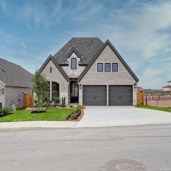Home office with French doors set at entry with 11-foot ceiling. Open kitchen offers center island, a 5-burner gas cooktop, and corner walk-in pantry. Dining area is adjacent to open family room with wall of windows. Spacious primary suite. Dual vanities, garden tub, separate glass-enclosed shower and large walk-in closet in primary bath. Secondary bedrooms include walk-in closets. Covered backyard patio. Mud room off two-car garage.