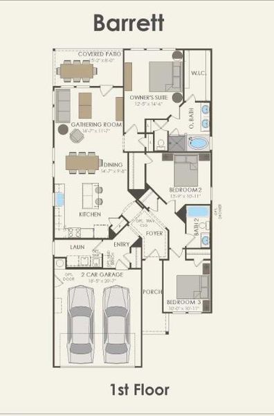Featuring must-haves such as an open island kitchen and covered back patio, the Barrett is a cozy home with thought put into every inch. The bedrooms are spacious, with great closet space. The gathering room overlooks the covered back patio, which can be optionally extended for even more room to entertain or dine.