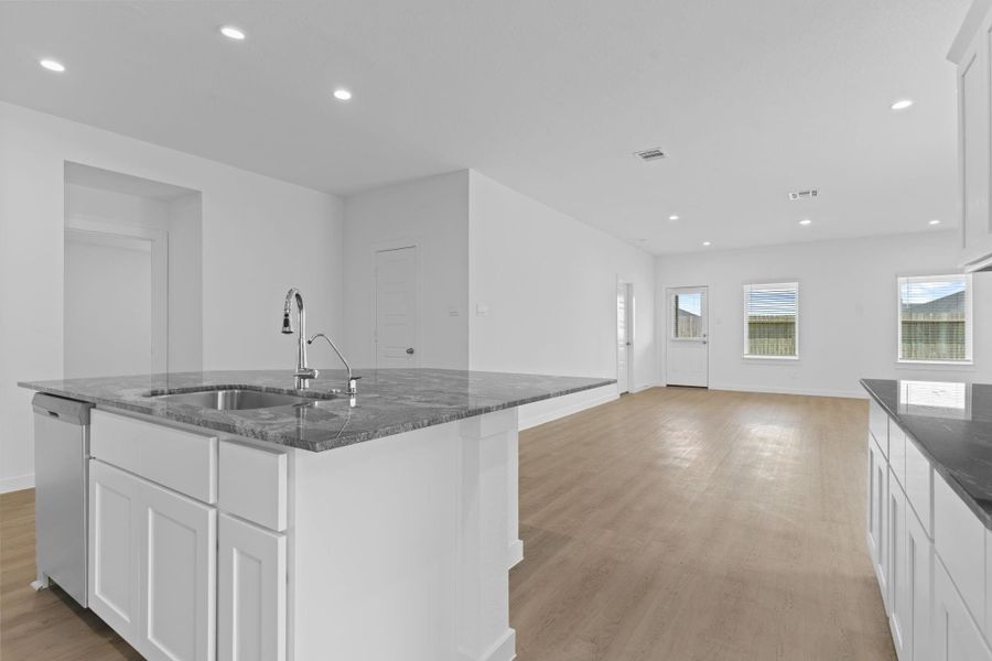 At the end of the foyer, the family room, dining room, and L-shaped kitchen offer an open-concept space perfect for entertaining. The kitchen includes extra counter space, a kitchen island, a pantry, and stainless-steel appliances. The utility room offers washer/dryer space and extra storage.