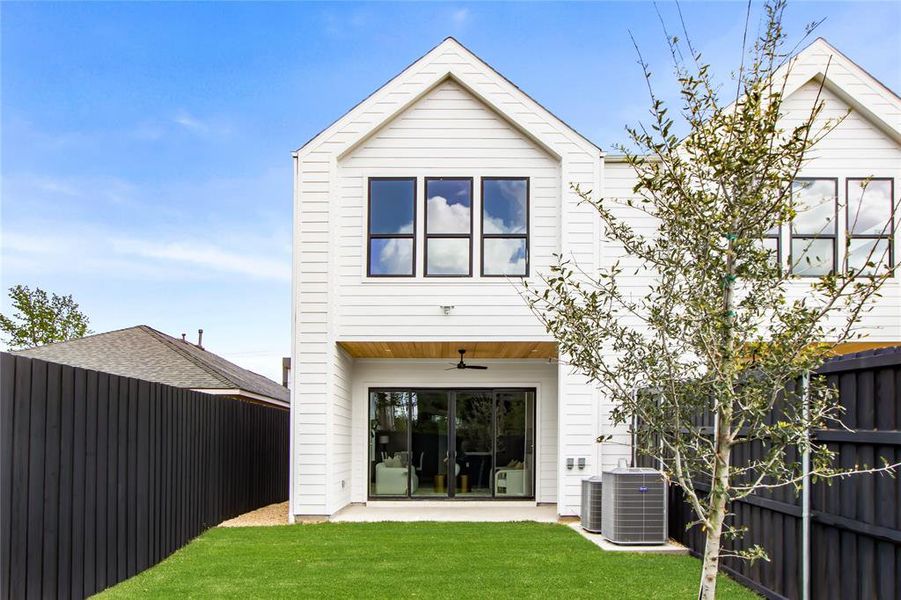 Each bedroom includes its own en-suite bath, while the primary suite serves as a private retreat with expansive windows, a spa-inspired bathroom, and a generous walk-in closet. A covered outdoor living area and crisp architectural lines further enhance the home’s modern, cohesive design.