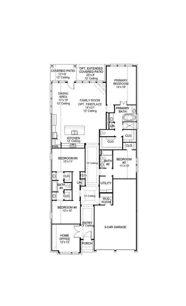 Welcoming porch extends to entry with home office at entry. Open family room with 12-foot ceiling and a large wall of windows. Dining area offers generous natural lighting with wall of windows. Island kitchen with built-in seating space, a 5-burner gas cooktop, and a corner walk-in pantry. Private primary suite features bedroom, double door entry to primary bathroom, dual vanities, a freestanding tub, separate glass enclosed shower and two walk-in closets. Secondary bedrooms with walk-in closets, a utility room and a Hollywood bathroom completes this spacious design. Extended covered backyard patio. Landscape features a 6-zone sprinkler system. Mud room just off the three-car garage.
