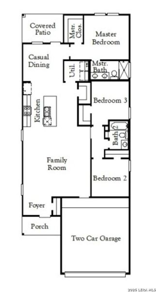 Welcome to the Frio floor plan-a stylish single-story home designed for modern living. Step into this bright, open layout featuring three bedrooms, two bathrooms, and a two-car garage, making it ideal for both everyday comfort and entertaining. Inside, the open-concept design seamlessly connects the living, kitchen, and casual dining areas. The kitchen is the heart of the home, showcasing a large island, gray cabinetry, subway tile backsplash, granite countertops, stainless steel appliances, and soaring 9-foot ceilings that enhance the spacious feel. Step outside to a covered patio, perfect for relaxing or unwinding. The expansive primary suite offers a walk-in closet and a well-appointed bathroom with an oversized shower, creating a private retreat. Don't miss your opportunity to tour this beautiful home on a corner homesite-schedule your visit today!