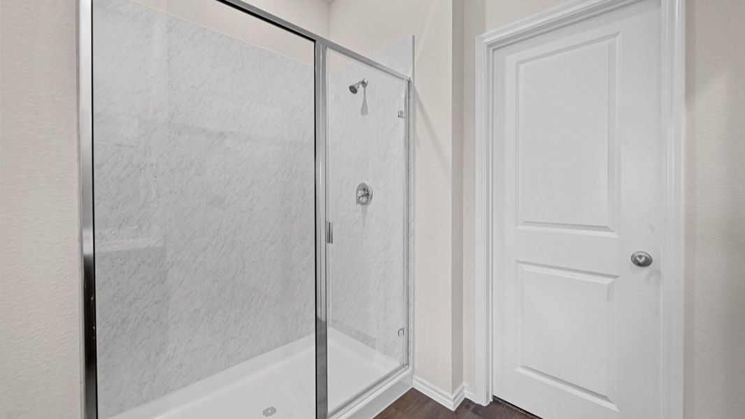 The primary bedroom, designed for relaxation, includes an adjoining bathroom that simplifies daily routines. An elongated vanity with a sink and non-framed mirror, along with a walk-in shower and closet, ensures both comfort and convenience. Laminate wood plank flooring in the living areas and plush ½” carpet in the bedrooms create a warm and inviting atmosphere.