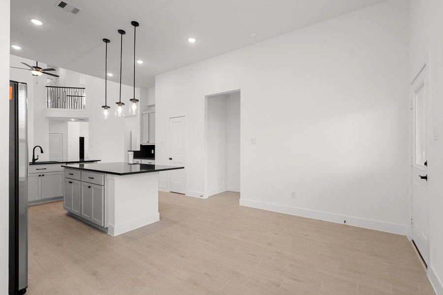 OVERSIZED backyard large enough for a pool. This never lived in 2-story home offers soaring ceilings open to the second floor. 42" White kitchen cabinetry with gold hardware. White quartz countertops. Gold lighting & plumbing fixtures throughout. Wood look porcelain tile flooring. Iron stair parts. Primary retreat down with separate tub & shower. Secondary bedroom up with en-suite bath for privacy. Full sprinkler system front & back. Gas line on back patio for future outdoor kitchen. Garage door openers. 2" faux wood blinds, tankless water heater, 16-SEER HVAC with Merve 11 fresh air filtration system.