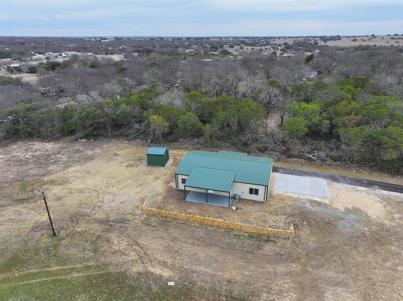 Affordable country living awaits in this newly built barndominium styled home set on 1.54 acres atop a gentle hill. The open-concept layout features soaring vaulted ceilings in the living room and a spacious island kitchen designed for gathering. The primary suite sits just steps from the oversized laundry room and includes a well-appointed bathroom and a generous walk-in closet. With a split-bedroom design, everyone enjoys added privacy. Relax on the large back porch and take in the peaceful spring evenings overlooking the Silverado Ranch which ensures backyard privacy. A separate storage building provides plenty of space for tools, equipment, and outdoor essentials. A versatile property with endless possibilities. 200 feet or asphalt drive and a concrete pad at the house means plenty of parking space. Slab was pre-treated for termites.