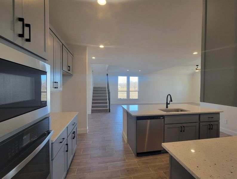 - Microwave OvenElectric CooktopGranite countertopKitchen IslandElectric Oven