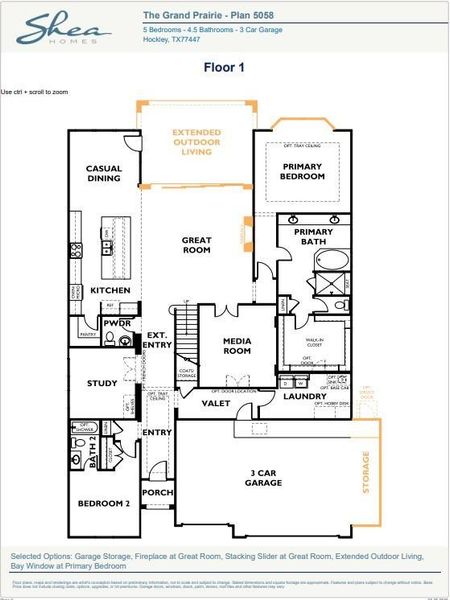 Built by SHEA HOMES Est. completion July 2026- Experience elevated living in this stunning 5-bedroom, 4.5 bath home. Showcasing the sophisticated Elevation E exterior, this home blends stucco and brick and is beautifully accented by a striking Moire' Black roof for bold, modern curb appeal. The heart of the home features an expansive Great Room that seamlessly connects to the kitchen and casual dining area, with extended outdoor living just beyond, ideal for indoor and outdoor gatherings. The private primary suite is tucked away on the main level and features a spa-inspired bath with a free-standing soaking tub, oversized shower, dual vanities, and a generous walk-in closet. A dedicated media room, private study, and secondary bedroom downstairs provide flexibility for work, guests, or multigenerational living. This exceptional home delivers architectural elegance, functional design, and forward-thinking technology-all in one distinguished home.