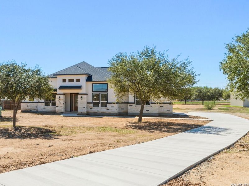 This stunning home will leave you absolutely speechless from the moment you arrive. The exterior is beautifully illuminated with extensive lighting and showcases an elegant blend of limestone and stucco. Step through the entry with soaring 14-foot ceilings and impressive 10-foot doors that lead into a spacious great room designed to impress. As you enter, look up and admire the striking lighting, architectural details, and lighted arched art niches that set the tone for the entire home. To the right of the entry is a versatile fifth bedroom or study, highlighted by incredible ceiling details. The great room opens seamlessly to the covered rear patio, already equipped for a TV-perfect for entertaining or relaxing outdoors. The incredible kitchen features a large island and breakfast bar, ideal for gatherings and everyday living. To the left, one hallway leads to a private second master suite, while another leads to the generously sized third and fourth bedrooms. On the right side of the home, near the dining area, you'll find the gorgeous primary master suite. The ensuite bath offers a luxurious separate shower and garden tub, along with a spacious walk-in closet designed to meet all your storage needs. Throughout the home, all bedrooms feature oversized ceiling fans and plush carpeting, while all living and wet areas are finished with durable ceramic tile flooring. The oversized garage is equally impressive, offering 10-foot doors ideal for trucks or SUVs, an EV charger, garage door opener, water softener loop for easy installation, and insulation in both the walls and ceiling. Situated on a generous 0.75-acre lot, this property offers mature trees in the front and a blank canvas in the rear-ready for your dream outdoor space. Don't miss the opportunity to see this exceptional home before it's gone. ***Pictures 16-50 are from a similar home. This home will be ready beginning of March 2026