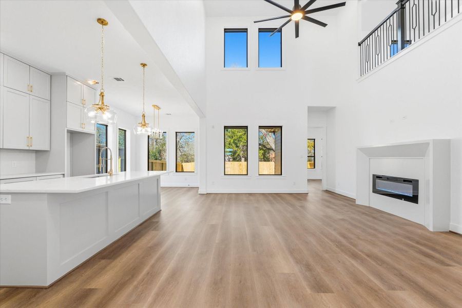 Welcome to 741 S Carroll! A striking stone & brick exterior, extra-wide driveway, soffit lighting, and exterior outlets add curb appeal and functionality. Inside, enjoy 21-foot ceilings, luxury vinyl flooring throughout, and a dedicated office. The open-concept living area features a fireplace and flows seamlessly into the dining area and covered back patio.The kitchen showcases an oversized island, beveled quartz counters, gold hardware, custom solid-wood cabinetry, and stainless steel appliances. The first-floor primary suite offers 11ft ceilings, a spa-like en suite with glass-enclosed walk-in shower, dual sinks, and a spacious walk-in closet. A powder bath & laundry room complete the main level. Upstairs includes a versatile family room, secondary bedrooms with walk-in closets, and two full baths. The backyard features fresh grass, new fencing, a covered patio with ceiling fan and a mature tree. Insulated garage with automatic opener and storage!