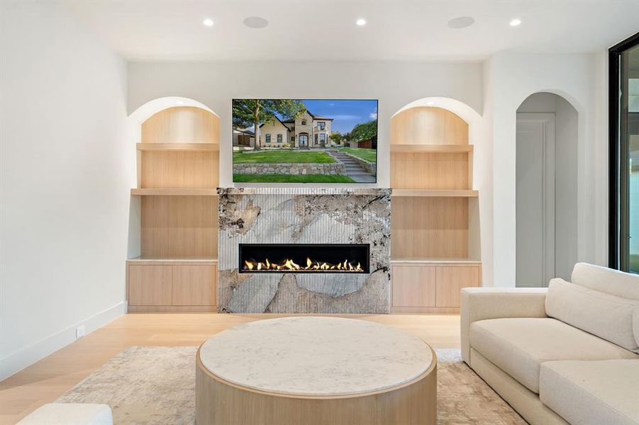 OPEN HOUSE SATURDAY FEB. 28TH, FROM 1-4PMNEWEST HOME in Kings Ridge! TOTALLY RENOVATED IN 2025! This fabulous home in popular Kings Ridge community was taken back to the studs and now shines with custom soft contemporary finishes you can't help but fall in love with! Every room glows with personal touches from Arteriors designer chandeliers, high-end European style cabinetry and luxury wide-plank wood flooring throughout. The wide open floor plan is flooded with natural light from an abundance of windows offering fantastic views of the huge covered patio, backyard with artificial turf (no mowing!) and sparkling pool and spa. Every day will be a vacation just steps from your back door! The gourmet kitchen beckons the chef to create culinary masterpieces to celebrate the holidays on the Dacor professional series appliances: gas cooktop plus a built-in oven and microwave. The large island with quartzite counter delights with pop-up electrical outlets so your devices are always ready to go! It flows directly to the living room with gorgeous gas fireplace surrounded by built-in display shelves and a dry bar with beverage fridge and wine storage! The re-designed primary suite is your oversized private oasis with a bay window showcasing the pool and backyard plus a spa-inspired bath: double vanity, oversized shower and 12x7 walk-in closet! A guest bedroom down features a private bath and would make a great home office. Revel in the custom architectural stair railing to the second floor with an sophisticated game room and three more bedrooms, each with a private bath. Other luxury touches include a tankless water heater, whole home water filtration, lightning rod protection and Lorex security camera system for advanced monitoring. All this close to 121, Grandscape, Legacy West and more!!!