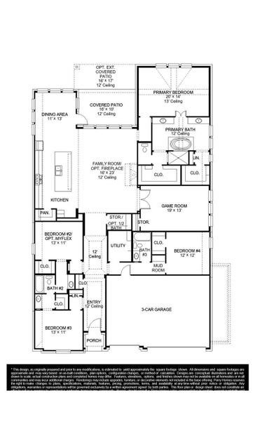 Extended entry leads to open family room, kitchen and dining area. Family room features wall of windows and a wood mantel fireplace. Kitchen hosts island with built-in seating space and a 5-burner gas cooktop. Game room with French doors just off family room. Secluded primary suite. Dual vanities, a freestanding tub, separate glass-enclosed shower and two large walk-in closets in primary bath. A Hollywood bath, high ceilings, large windows and abundant closet space add to this one-story design. Extended covered backyard patio. Mud room off three-car garage.