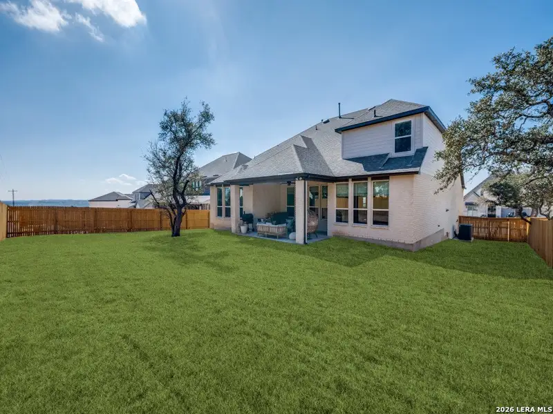 Premium estate size lot (80' x 144') on the elevated portion of The Ranches At Creekside subdivision with hill country views. Built in 2024 when the new section opened, a premium estate lot with approximately $40,000.00 of tastefully selected upgrades were chosen. This Sheffield floor plan by Highland Homes has five bedrooms, primary and secondary (with ensuite bathroom) downstairs, and four and half bathrooms, three living areas, study, game room and a media room. A beautifully designed kitchen is a cooks dream with a gas cooktop, pot filler, walk in panty and large island for friends and family to gather around. The covered patio faces east, which in south Texas is important. The backyard has additional privacy and is ready for grilling with a gas hookup. Enjoy the sunsets and hill country views from the front porch. Community center includes pool, clubhouse, trails and playgrounds. and walking/jogging trails. Zoned to highly rated Boerne ISD, the property offers convenient access to Highway 46 and I-10, fifteen minutes to Six Flags, thirty minutes to Sea World, and large shopping centers, and thirty minutes to San Antonio airport. Be sure to explore the 3D tour, and in-person tour as this the photos do not do this amazing property justice. Schedule a showing today!