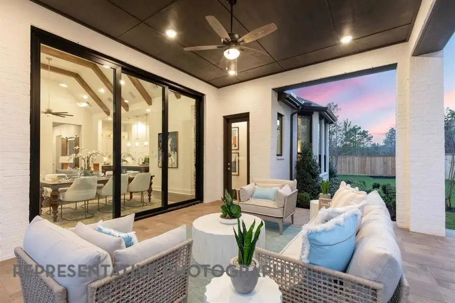 The Surrey is a thoughtfully designed floor plan that blends functionality and comfort, beginning with a welcoming entryway that leads you to two bedrooms, both complete with their own private baths followed by an additional bedroom with a bath nearby. Features a half bath for additional convenience. Continuing down the hall, you'll pass the study and a spacious entertainment room- perfect for gatherings. Adjacent is a modern kitchen with an island, seamlessly connected to a living room with a fireplace and dining area that opens onto a patio, ideal for indoor-outdoor living. The primary suite is privately situated at the back, featuring an ensuite bathroom with a freestanding tub and ample closet space. A two-car garage offers additional storage and convenience. Enjoy access to Landmark by Hillwood’s resort-style amenities, trails, and prime Denton location with easy access to shopping, dining, and major highways.