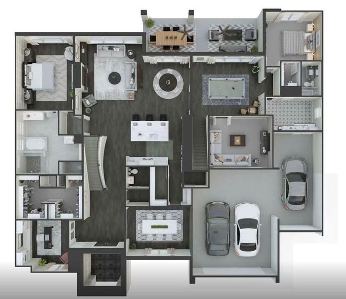 Incredible two-story plan with 5 bedrooms (2 down), 5.5 baths and a 4-car garage. This open-concept design has a grand staircase in the foyer and soaring ceilings in the foyer and great room. The first floor includes a formal dining room, 2nd bedroom down, a walk-in pantry, drop zone, a home office, breakfast room, a media room, a game room, a gourmet kitchen, and a covered patio. Benefit from an additional game room upstairs and 3 bedrooms.
