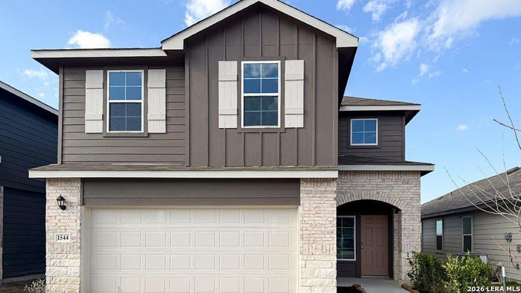 Welcome to The Kate floor plan, a two-story home located at Winding Creek in New Braunfels, TX. This home features 2 classic front exteriors, 4 bedrooms, 2.5 baths, a spacious 2-car garage and 2223 square feet of living space. An arched, covered patio (per plan) opens to the gourmet kitchen which includes quartz counter tops, stainless steel appliances and shaker style cabinets. The Kate is an open concept floorplan with the kitchen island overlooking a dining nook and living room so you'll never miss a moment. This home is unique in that all bedrooms are located upstairs, along with a loft and utility room. If entertaining downstairs and maintaining a private retreat upstairs is your goal, this floor plan is the one for you. The main bedroom has its own attractive ensuite bathroom that features a walk-in closet and all the space you need to get ready in the morning. You'll love a quartz single vanity sink, shaker style cabinetry, a tiled walk-in shower, and a separate water closet for the toilet. Your secondary bedrooms all have quality carpet flooring, large windows and closets. Whether these rooms become bedrooms, office spaces, or other bonus rooms, functionality is key. Additional features include sheet vinyl flooring in entry, living room, and all wet areas, quartz counter tops in all bathrooms, and full yard landscaping and irrigation. This home includes our HOME IS CONNECTED base package. Using one central hub that talks to all the devices in your home, you can control the lights, thermostat and locks, all from your cellular device.