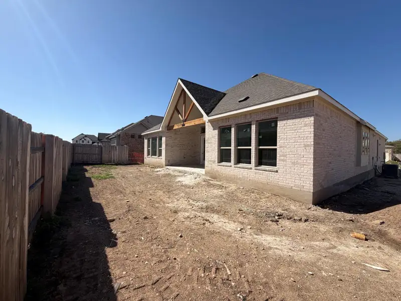 The lowest cost for luxury living in Leander. Gorgeous vinyl plank flooring throughout main living, with square edged high level quartz counter tops in kitchen AND master bath and added natural Barley color cabinets extended into the dining with matte black cabinet pulls, topped off with a farmhouse kitchen sink w/ one piece faucet all to come together for a beautiful cohesive presentation. Stand up shower with ceramic tile flooring is added in the guest bathroom for convenience. Master suite bath is fully elevated with larger sized shower with a frameless glass, ceramic tile floor to ceiling and drop in tub for comfort. Added water softener loop in garage and gas drop on back covered patio for capability to connect a natural gas BBQ with intention to be more cost efficient and add to convenience of not having to deal with refilling propane tanks.