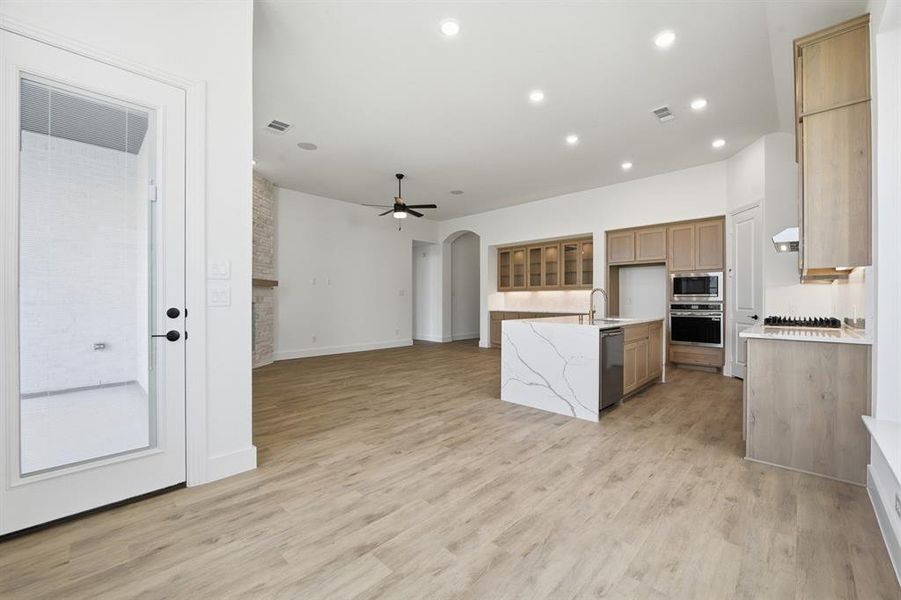Beautiful Denton Plan on Premium Corner Lot, Move-In Ready! Fully upgraded Denton floorplan featuring 3 bedrooms, 2.5 baths, private office, and media room on a desirable corner lot with gorgeous sunset views and a fenced backyard for added privacy. The open living area showcases a dramatic floor-to-ceiling stone fireplace and luxury vinyl plank flooring throughout most of the home. The designer kitchen impresses with Level 3 quartz waterfall island flowing into the backsplash, stacked upper cabinets, 5 burner gas cooktop, built-in microwave, oven, and oversized glass-front hutch. The specialty painted media room is ready for movie nights with surround sound speakers and full entertainment prewire, while both the media and laundry rooms feature custom specialty paint for added designer flair. The primary suite offers an oversized spa shower, and brushed gold hardware and fixtures throughout the home create a cohesive, upscale finish. Additional highlights include an epoxy-coated garage floor and an extended covered patio with gas stub, perfect for outdoor entertaining. Located in Pecan Square with A-rated schools and resort-style amenities including pools, pickleball courts, dog parks, and open space directly across the street. Move-in ready!