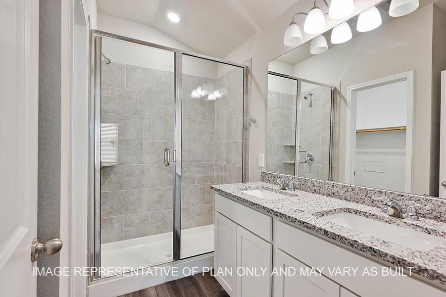 This home sits on a corner lot with no rear neighbors. The Auburn floorplan at Southern Pointe in College Station, Texas is a 3-bedroom, 2-bathroom single-story home covering approximately 1,370 sq. ft. The 2-car garage has ample space for vehicles and storage. In this floorplan, you’ll find a home that makes the most of its space. The kitchen features a beautiful quartz countertop island to prep meals or spend time together as it flows into the great room and dining area, complete with a dining nook. Enjoy nature from the backyard covered patio that is attached to the dining area. Here you can start or end your day relaxing with nature. The bedrooms are carpeted, and the primary bedroom has an attached bathroom with a walk-in shower that can be opted for a tub with shower. The two secondary bedrooms share a functional bathroom between them, along with spacious closets space for storage.