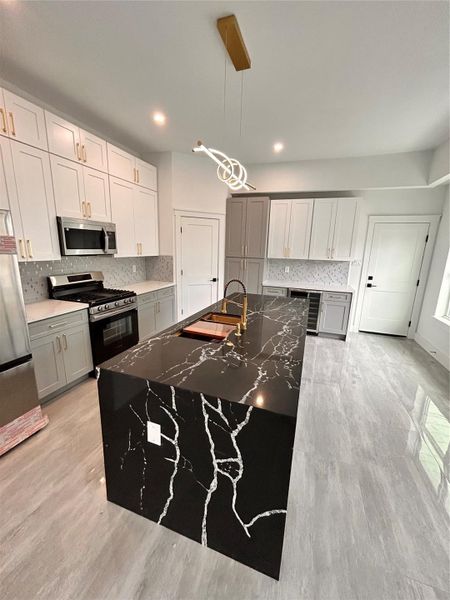 Inside, enjoy an open-concept layout, abundant natural light, and upscale designer finishes throughout. The chef-inspired kitchen showcases quartz countertops, stainless steel appliances, a waterfall-style island, and a built-in wine cooler, ideal for entertaining.