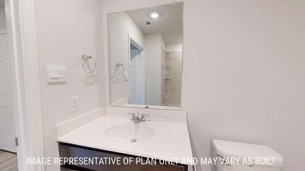 Check out the Caden, a floorplan at our Wilkins Valley community in Brenham, Texas. With 3 bedrooms, 2 bathrooms, and approximate 1,595 sq. ft., this single-story home is designed to fit your needs with a 2-car garage gives you space for storage and vehicles. When you first enter the home, you’re greeted with both secondary bedrooms and easy access to the secondary bathroom. Continuing through the home, you’ll find the open-concept kitchen, dining, and living areas. This kitchen boasts easy shaker-style cabinetry, quarts countertops, and stainless-steel appliances. You’ll also have a functional kitchen island, along with a spacious shelved pantry. We’ve also placed both the utility room and extra storage between the garage and kitchen. Through the living room, you’ll find the primary bedroom with an attached bathroom and roomy walk-in closet. These finishes include quarts vanity tops and ceramic tile shower surround. Plus, linen shelving for even more storage.