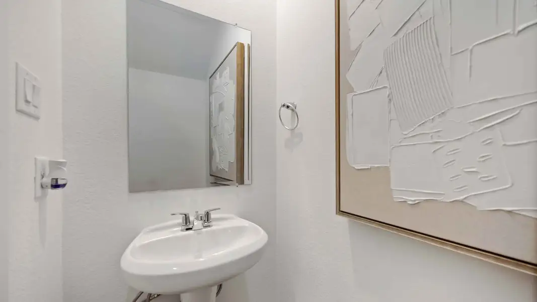 The living and dining areas are flooded with natural light, thanks to three large windows and a door that leads directly to the backyard, offering an easy flow between indoor and outdoor spaces. Just off the living area, you'll find a convenient powder room for guests.