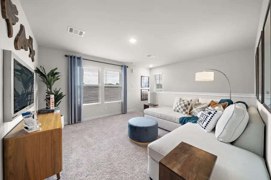 The Hampton two-story home is an open-concept floor plan featuring the primary suite privately situated on the first floor, while the secondary bedrooms are on the second floor. The gourmet island kitchen overlooks the great room and the dining room, creating a spacious entertaining area. And the upstairs gameroom offers a secondary entertainment space for the home.