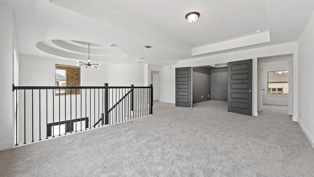 This exquisite two-story home features four bedrooms and 3.5 beautifully appointed bathrooms. The family room and informal dining area, both under a stunning two-story cathedral ceiling, create an inviting space for gatherings. The modern kitchen, complete with an extra-large island, is perfect for culinary endeavors. The master suite, situated on the main level, boasts his and her walk-in closets, dual vanities, and a soaking tub. Additionally, a second bedroom with a full bath is conveniently located downstairs. Upstairs, you'll find a game room and a media room, ideal for entertainment. A covered patio enhances the outdoor living experience, and the three-car tandem garage provides ample parking and storage.