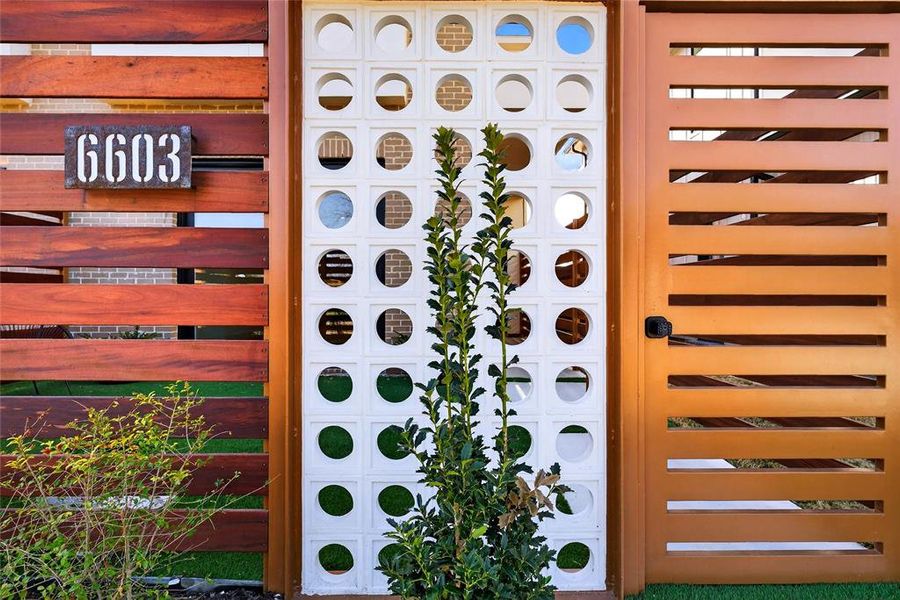 A serene courtyard offers additional all year green space with landscape turf surrounded by tigerwood panels and a gate equipped with finger print scan and code lock for added security.